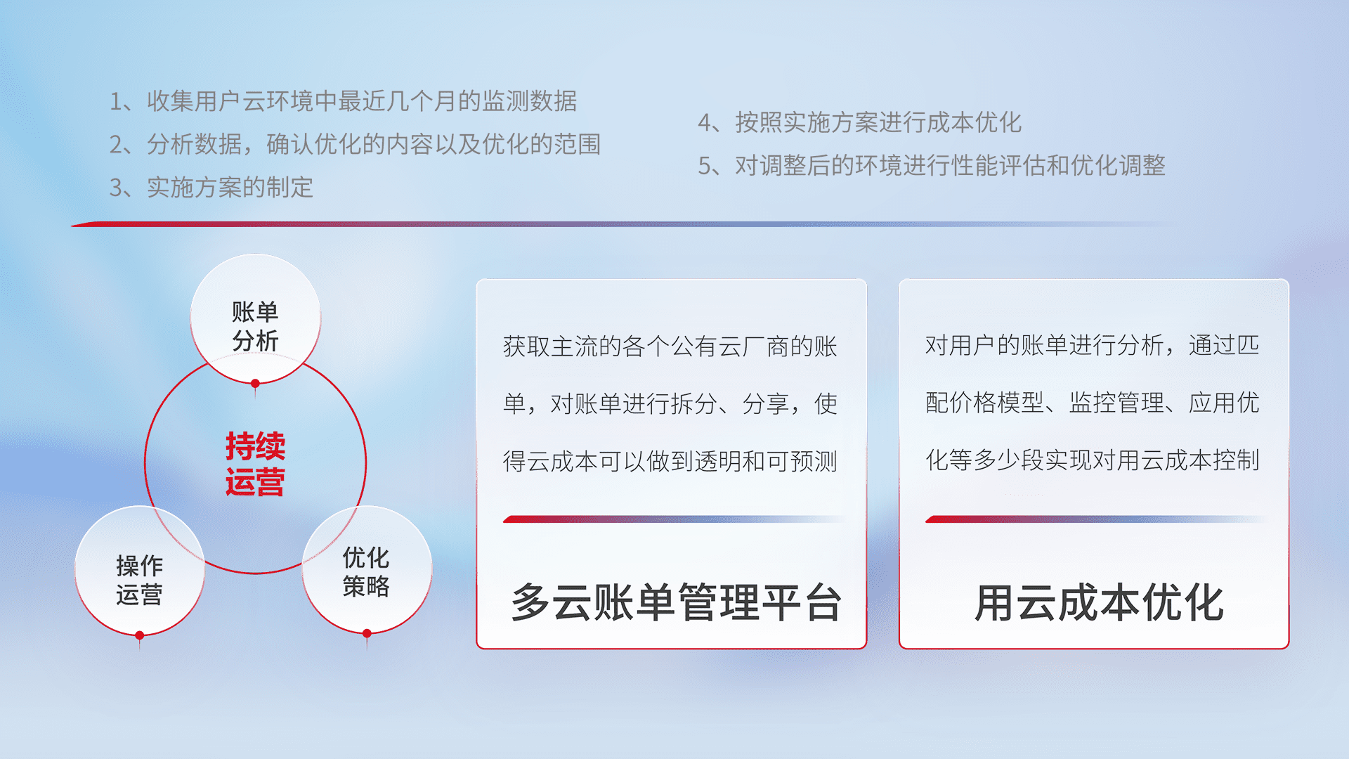 通过多云纳管,,,以统一的资源数据模型把客户的云资源进行抽象和封装,,进而实现对多云资源的统一操作,,,,保障云资源管理的可靠性、、、、稳定性与可用性。。量身定制化运维内容,,,,配置、、开发运维、、、、补丁管理、、、备份、、、监控、、、、认证和访问管理、、、、审计和日常巡检等,,保障在用云过程中的可靠度,,,稳定度以及高可用率。。
